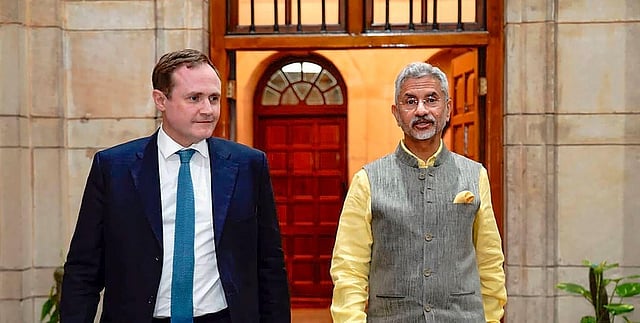 External Affairs Minister S Jaishankar with UK Minister of State Tom Tugendhat in New Delhi, Thursday, Aug 10, 2023. (Photo | PTI)