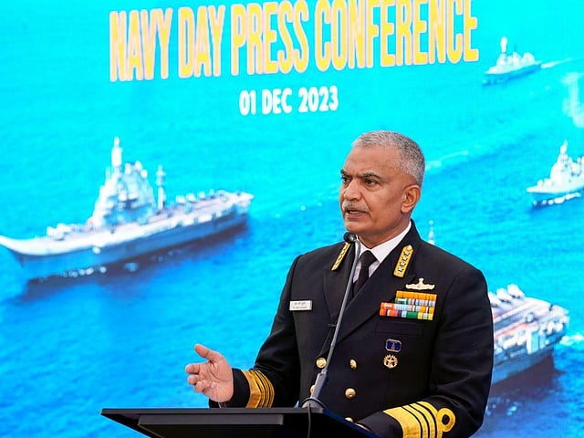 Chief of the Naval Staff Admiral R Hari Kumar addresses a press conference ahead of the celebration of Navy Day, in New Delhi, Friday, Dec. 1, 2023. (PTI Photo)
