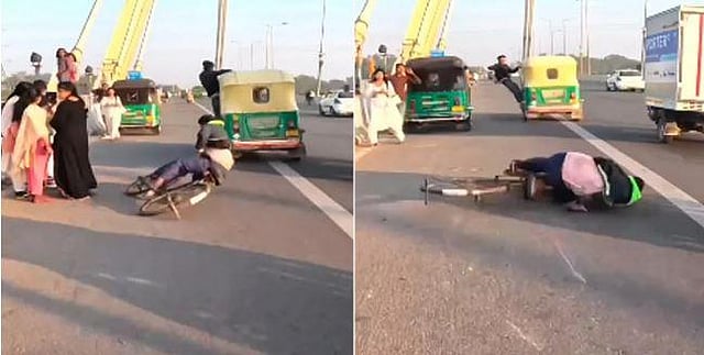 The video shows a man swinging from a speeding autorickshaw and touching the vehicles that are passing by him on the busy road. He then collides with a cyclist and knocks him down, leaving him injured.