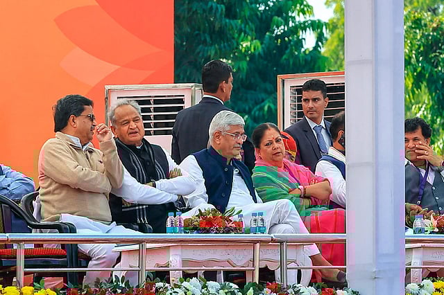 JAIPUR: Outgoing chief minister of Rajasthan Ashok Gehlot on Friday reached the swearing-in ceremony of the new chief minister Bhajan Lal Sharma and sat next to "rival" Gajendra Singh Shekhwat.