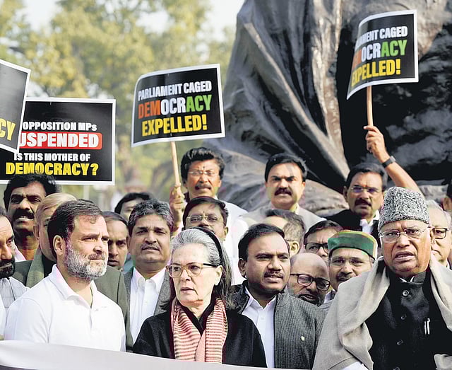 The decision was taken at a meeting of the floor leaders of Opposition leaders of both the Houses at Congress chief Mallikarjun Kharge’s house. The leaders have also sought action against BJP MP Pratap Simha, who authorised the visitor pass for the intruders who jumped into the Lok Sabha gallery.