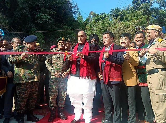Defence Minister Rajnath Singh dedicated 28 infrastructure projects of the Border Roads Organisation (BRO) to the nation during an event in Arunachal's Siang. (Photo | ANI)
