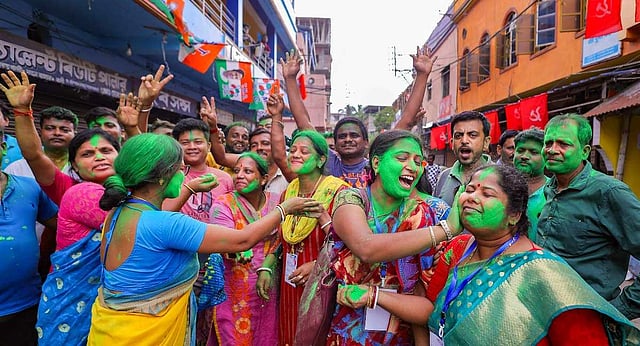 In various districts, TMC supporters celebrated their victory by dancing and smearing each other with green colour, the party's chosen colour.