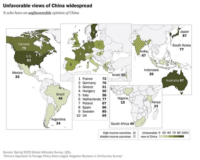 The poorest opinions of China and its actions on the global stage were, expectedly, seen in western countries, such as the US (83%), Canada (79%), Sweden (85%), Germany (76%), France (72%) and the UK (69%).