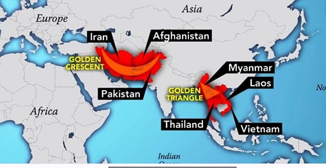 India has been sandwiched between the Death (Golden) Crescent comprising Afghanistan, Iran, and Pakistan and Death (Golden) Triangle comprising Vietnam, Thailand, Laos and Myanmar and has been flooded with drugs, especially heroin and methamphetamine, from these two regions. “Now African nations are being used as re-routing hubs,” says the MHA official.