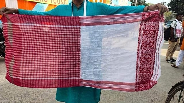 One half of the scarf was an Assamese 'gamosa' with a red border on a white cloth, while the other half was of a red-and-white checked pattern, used by the Bengali community.