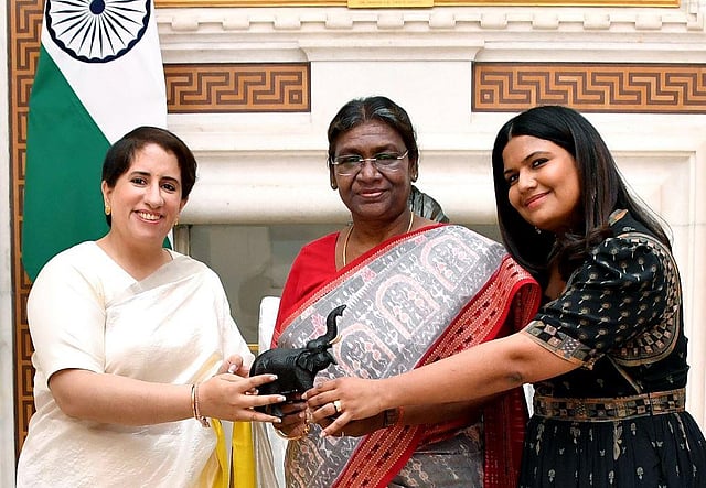 President Droupadi Murmu met Kartiki Gonsalves and Guneet Monga, the makers of the Oscar-winning documentary 'The Elephant Whisperers', at Rashtrapati Bhavan. (Photo | Rashtrapati Bhavan Twitter)