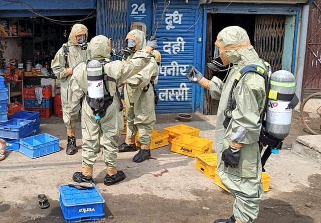 National Disaster Response Force (NDRF) team at the site after a gas leak incident in the Giaspura area, in Ludhiana district, Sunday, April 30, 2023. (Photo | PTI)