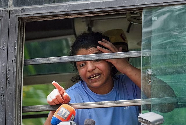 Wrestler Sakshi Malik after being detained by police during wrestlers' protest march towards new Parliament building, in New Delhi, Sunday, May 28, 2023. (Photo | PTI)