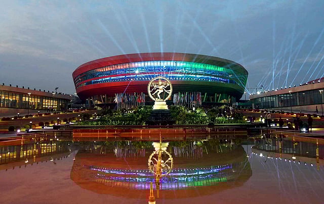 The decked up 'Bharat Mandapam' ahead of the upcoming G20 Summit, at Pragati Maidan in New Delhi, Wednesday, Sept. 6, 2023. (Photo | PTI)