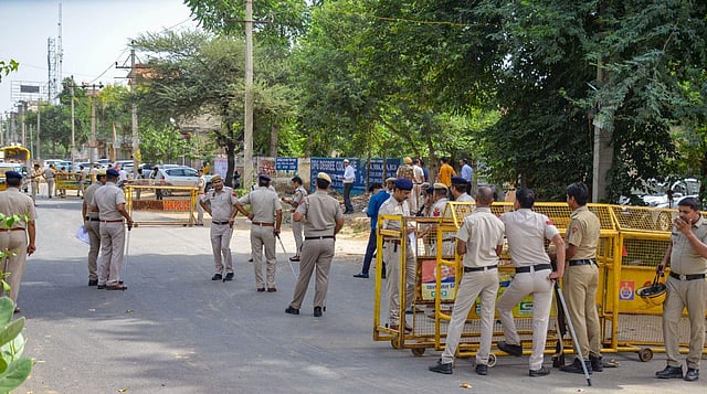 FILE - Police personnel stand guard, weeks after violence in the region, in Gurugram district, Monday, Aug. 28, 2023. (Photo | PTI)