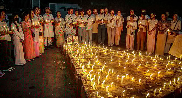 Women take part in a candlelight vigil, in Imphal, against the killing of two missing Meitei students by unknown miscreants, Sept 27, 2023. (Photo | PTI)
