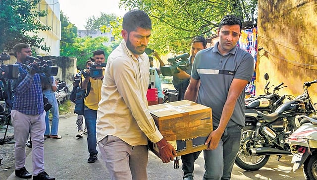 Material confiscated after the raid on the office of NewsClick being brought to Special Cell office on Tuesday |
