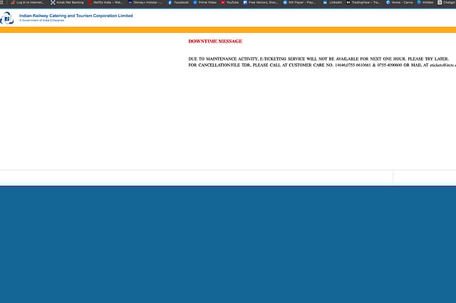 During the downtime, users attempting to log on to the website saw a message stating, "Due to maintenance activity, e-ticketing service will not be available for next one hour. Please try later." The message also provided customer care contact numbers and email addresses for users needing to cancel tickets or file a TDR (Ticket Deposit Receipt).