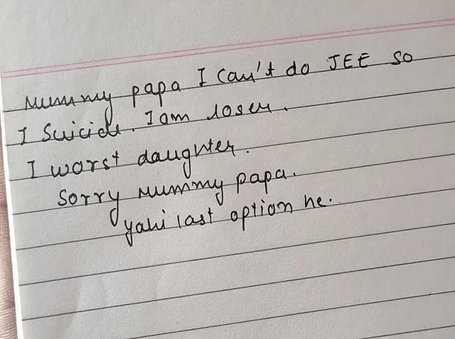“Mummy, papa I can't do JEE. So I suicide,” the note scrawled in English said, according to police. She was to give the JEE test in a day or two.