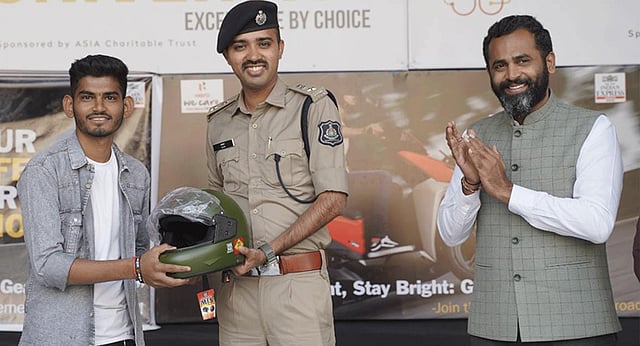 In the presence of Safin Hasan, the Deputy Commissioner of Police for Traffic in Ahmedabad, Jayrajsinh Vala, the Deputy Commissioner of Police for Special Operations Group-Crime Branch, Ramesh Merja Deputy Municipal Commissioner, South West Zone, and other dignitaries, the New Indian Express Group handed out jackets and helmets to the riders as part of an initiative.