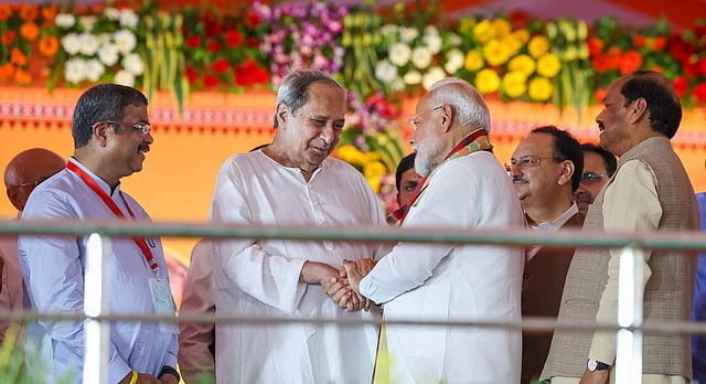 There was a huge cheer when Naveen reached the venue, the crowd being BJP workers and supporters notwithstanding. As the former CM was greeted and escorted on the dais by Union Education Minister Dharmendra Pradhan, Union Home Minister Amit Shah rushed to him and ushered him to his assigned seat. Naveen was greeted by Union minister Nitin Gadkari and national president JP Nadda, who was seated by his side.
