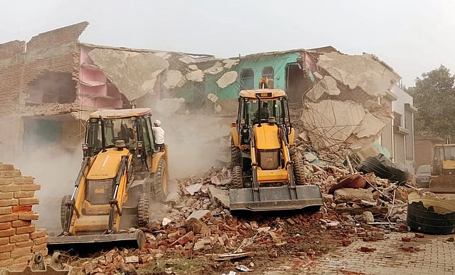 MANDLA: Houses built on government land by 11 persons were demolished in tribal-dominated Mandla in Madhya Pradesh as part of action against the illegal beef trade in the state, a police official said on Saturday.