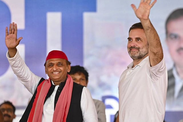 Addressing the gathering at a joint rally to seek support for Congress candidate Pradeep Jain, Akhilesh Yadav focused on the 'dwindling' fortunes of the BJP while Rahul Gandhi continued his narrative to scrap Agniveer scheme and 'to safeguard Constitution' from saffron brigade.