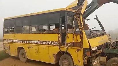 Owning to dense fog, a school bus collided head-on with a loader on the Chajpur-Rajpur Road in Uttar Pradesh's Muzaffarnagar, causing injuries to at least 10 students.