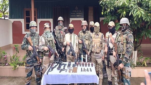 From B Phainom village in Thoubal district, security forces seized one 9 mm SMG carbine along with a magazine, two SMG carbine magazines, one hand grenade, 13 live rounds, one detonator, two tear smoke shell soft nose, and two radio sets.