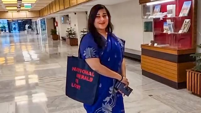 Her black bag had "National Herald Ki Loot" emblazoned over it in red colour.