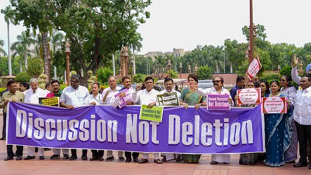 NEW DELHI: With a banner reading 'discussion not deletion', several MPs of the INDIA bloc parties staged a protest in the Parliament House complex on Wednesday against the Election Commission's voter roll revision in Bihar, and demanded its rollback as well as a debate on it in both Houses of Parliament.
