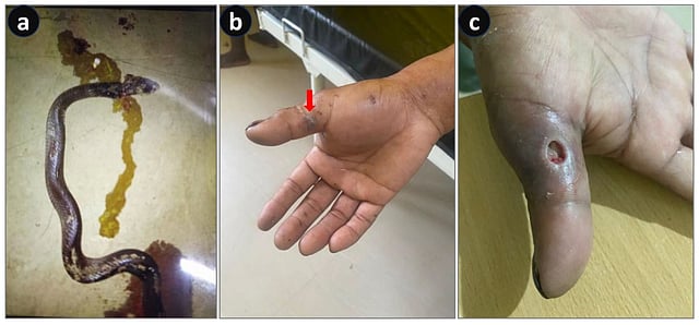 However, out of curiosity, a neighbour tried to hold its head and was envenomed on the little finger of his right hand. Since there was no pain or swelling, and considering the snake was already dead, he and his family members ignored the bite. However, the victim later started to feel uneasiness, sleeplessness, and body pain and gradually became restless.