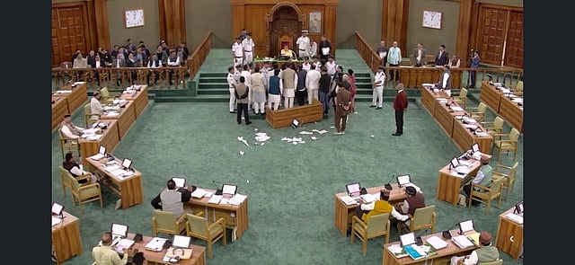 Congress MLAs not only ripped up the day's agenda but also tossed it into the air before staging a sit-in in the Well of the House. The protest escalated to physical damage, with opposition members reportedly breaking the Secretary's table, microphones, and tablets.