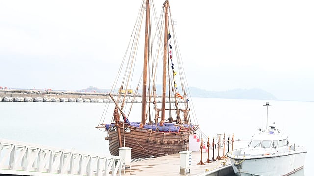 Unlike contemporary vessels, her wooden planks are stitched together using coconut coir rope and sealed with natural resins, reflecting a shipbuilding tradition once prevalent along India's coasts and across the Indian Ocean.