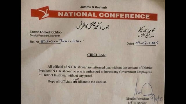 The NC District President Kishtwar in a circular stated that no official of the party’s Kishtwar unit is authorised to harass any government employee without the consent of District President NC Kishtwar.