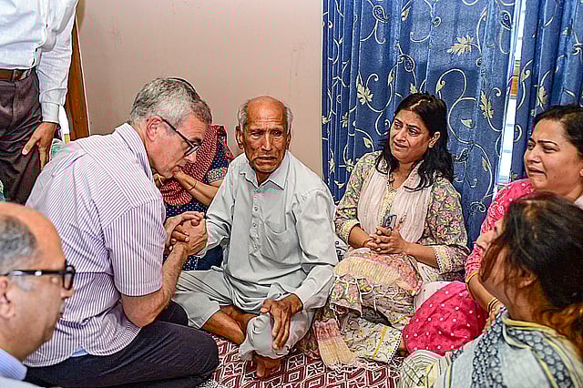 Chief Minister Omar Abdullah visited the bereaved family at Roopnagar and was seen hugging his father, Durga Dass, to condole his son's death.