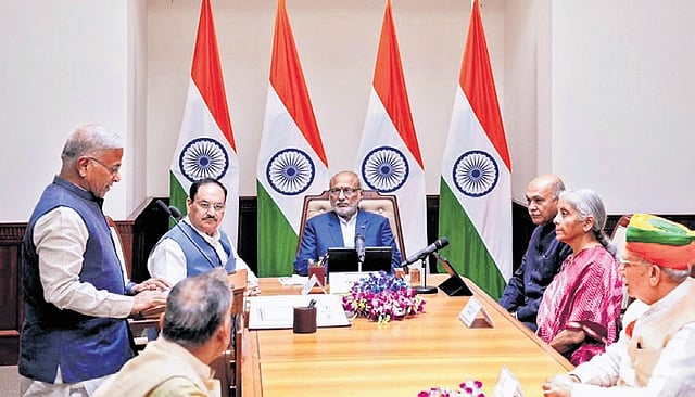 Leader of the House in the Rajya Sabha J P Nadda, Finance Minister Nirmala Sitharaman, Minister of State for Law and Justice Arjun Ram Meghwal, and Minister of State for Agriculture and Farmers’ Welfare Ram Nath Thakur were present during the oath-taking ceremony.