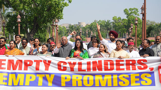 Holding a large banner reading “Empty Cylinders, Empty Promises,” the MPs raised slogans accusing the government of failing to ensure adequate LPG availability.