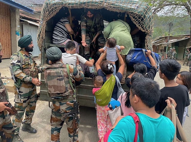 Army personnel rescue people from a violence-hit area of Manipur, Saturday, May 6, 2023. (Photo | PTI)