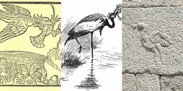 IN PIC ABOVE: (L) A woodcut illustration (c.1570) from a Latin translation of ‘The Crane Killed by the Crab’; an illustration by Gordon Browne for the story of ‘The Crane and the Crab’; the carving of a crane on the outer wall of Sri Bala Krishna Temple in Hampi (c. 1515)