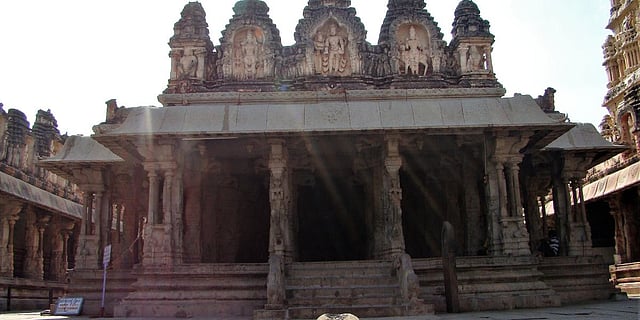 Presently, the Virupaksha temple's maharangamantapa is the only Vijayanagara monument in Hampi with paintings that have survived till date. It was built by Vijayanagara Emperor Sri Krishnadevaraya in 1509 CE to commemorate his coronation. The paintings occupy the large ceiling of the maharangamantapa. They are divided according to subjects in a rectangular compositional frame. The Trimurtis along with their spouses and retinue are depicted in an individual composition. The other important themes like Girija Kalyana, Tripura Samhara Shiva and Kama disturbing Shiva's penance are composed in one row in the central space of the ceiling. In the subsequent scene, the wedding of Shiva and Girija is narrated and in the lower strata of this episode, the Dashavatara images of Vishnu are painted in a row. Other important themes are Rama breaking Shiva's bow to marry Sita and Arjuna shooting an arrow at the rotating fish to marry Draupadi. Both the themes are connected to swayamvars and culminate with the illustration of the respective wedding scenes. Besides the above, Kama and Rati are depicted as riding pancha nari turaga (horse composed of five women) and nava nari kunjara (elephant composed of nine women). The whole lintel of the hall has been covered with paintings depicting varied themes.