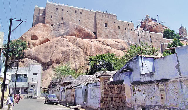 Another cave temple of the same century at a slightly lower level belongs to the Pandya dyasty. Here, on the wall are large images of Ganesha, Kartikeya, Brahma, Surya and Durga in a row. Vishnu is enshrined in a separate sanctum and there is another shrine which would have been for Siva, but there is no image or Linga there now. A Jain cavern and inscriptions in the ancient Brahmi script have also been discovered on Rockfort.