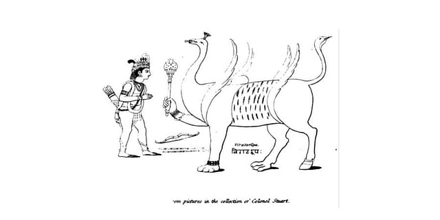 The theme, to the best of my knowledge, is very rare in Vijayanagara art. Edward Moore (1771–1848) in his book, The Hindu Pantheon (1810), published a line engraving of Navagunjara with the name tag of Viratarupa. The engraving was done by Matthew Haughton (1766–1821), a British painter and engraver in London. Moore had collected a painting of Navagunjara from Charles Stuart (c. 1758–1828), who worked as an army officer at Kolkata under the East India Company. Stuart wrote several newspaper articles and books on Hinduism, including Vindication of the Hindoos (1808), and became well known in his own lifetime as the Hindoo Stuart. It’s possible that Stuart had gone to Odisha and collected the picture from the region, most likely in Puri. Both Moore and Stuart had extensively quoted from the Bhagavad-Gita of Krishna from the Mahabharata. A stanza of the Gita says, “There Arjuna could see the totality of the entire universe established in one place, in that body of the God of Gods.” The stanza, in my opinion, perfectly matches with the visualisation of Navagunjara.