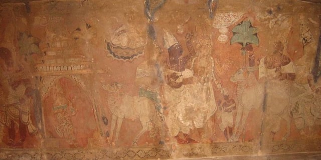 The Virabhadra temple has some exquisite and rare mural paintings of the Vijayanagara period. One important mural painting in its Natya mandapa is that of the legendary king Manu Neeti Chola, also known as Ellalan or Elara. The story of the king is mentioned in the Sri Lankan Buddhist chronicle Mahavamsa, which says Elara was a Damila (Tamil) of noble descent who came to Sri Lanka from the Chola country. He seized the throne from king Asela and ruled for a good 44 years, administering justice evenly towards friends and foes. He had a bell fixed at the head of his bed, and the rope of the bell was extended till the entrance of the palace. The objective was to allow people to ring the bell as and when they desired justice. Once, the prince was going on his chariot, and on its way, a calf came under the wheels unintentionally. The calf died on the spot and the mother cow in her grief approached the palace and rang the bell. Setting an example of justice, the king caused the prince’s head to be severed under the wheels of the same chariot.