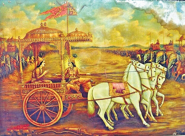 The Gita wastes no time and is good to go from its first verse: "dharmakshetre kurukshetre samaveta yuyutsavah/mamaka pandavaschaiva kim akurvata samjaya". This means, “On the battleground of Dharma, on the field of the Kurus, when my sons and the sons of Pandu assembled eagerly to fight, what did they do, Sanjaya?". And Sanjaya, gifted for the occasion with long-range vision, reports the happenings faithfully to Dhritirashtra as though he were a TV channel.