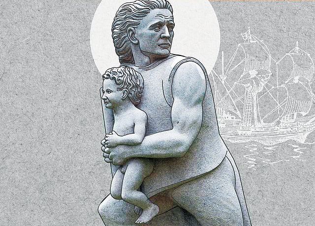 Carved from weathered sandstone, set upon a plinth shaped like a ship’s prow, stood the statue of Christopher Jones, captain of the Mayflower, the ship that carried English Pilgrims to America in 1620. It’s a voyage every American schoolchild learns about. He’s rendered as St. Christopher, the patron saint of travellers, carrying an infant.