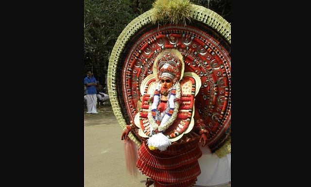 The word Theyyam is the local pronunciation of the word Daivam, denoting the divine. A unique aspect of this ritualistic dance form is the performers’ metamorphosis into the deity. The costumes and the performance will be based on a specific story of the god/goddess. For example, Kativanur Veeran would enact his fight against the Coorgi warriors with elaborate kalari movements. Likewise, in the Putiya Bhagavati Theyyam, which tells the story of a woman who burns the fort of her husband’s tormentor and immolates herself in that fire, she would appear with four big fire balls attached to her body. The stories used for the performances refer to, along with puranic tales, regional, local legends and family chronicles of North Malabar. There are a few stories that are a mixture of local traditions as well as Brahmanical ones, as in the case of the Vishnumoorthi. In Vishnumoorthi Theyyam, the Narasimha tale and the local tradition of Palantayi Kannan, a lower caste boy killed by a landlord, are depicted.