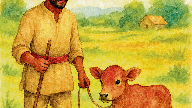 The greedy oilman saw the lovely calf and agreed. He gave Sona dinner and let him sleep in the verandah. In the middle of the night, the oilman got up and took out some oilcake that he used to feed his bullock. He moistened the oilcake and plastered it on the calf. Then he untied his bullock and took it where the calf was. The bullock started licking the calf. The oilman ran out into the village and started shouting that his bullock had given birth to a calf. The entire village gathered in his stable.