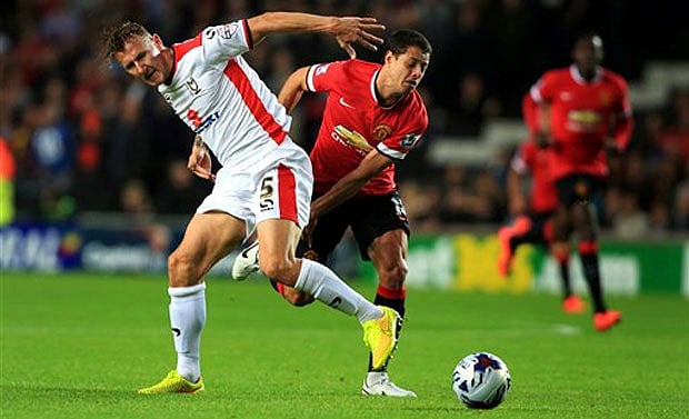 United had announced the signing of Angel di Maria from Real Madrid in a British-record £59.7 million ($98 million, 75 million euros) deal shortly before kick-off, but they were brought down to earth with a painful bump as a second-string team fell apart at Stadium MK.