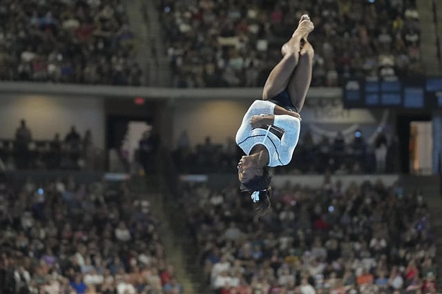 Her all-around total of 59.300 was well ahead of a brilliant Shilese Jones in second at 56.750 and put Biles in position to win a record eighth national championship on Sunday night. Biles’ total included a 15.7 for her showstopping vault, a score that included a near-perfect 9.8 for execution and a half-point neutral deduction for having Landi nearby.