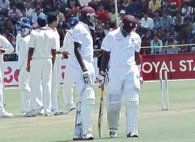 Until lunch, the match seemed like meandering to a draw. Zaheer, of whom quite a lot was expected this morning when he started the day’s proceedings from the Nripatunga Hills end, failed to live up to the expectations. From the other end though, Dhawal Kulkarni generated good bounce and pace off the wicket. But neither he nor Zaheer could seperate the overnight pair of Deonarine and Fudadin. It was finally left to Abhishek Nayar, who was brought in place of Kulkarni, to get the much-needed break. Fudadin, who had missed his half-century so narrowly in the first innings, failed to achieve that again. He nicked Nayar’s fifth delivery into the safe hands of Kaul behind the stumps.