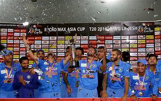 MIRPUR: India clinched the Asia Cup trophy for a record sixth time after beating hosts Bangladesh by eight wickets, riding on Shikhar Dhawan's scintillating 44- ball-60 in a rain-truncated final, here tonight.