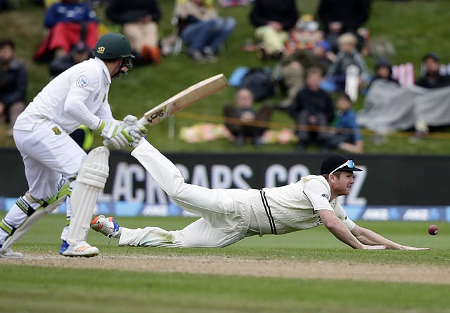 Elgar also had an alarm when dropped on 35 by wicketkeeper B.J. Watling, which might have been a good omen as Watling dropped him on 36 in his first innings, after which he reached his seventh test century. He had another reprieve on the last ball before tea when judged caught behind by Watling from the bowling of Patel: there was a clear sound but no sign on television replays that the ball had taken the bat.