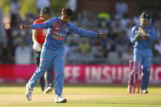 Kuldeep's scalps include three wickets in his third over when he had Morgan (7) caught in the deep and Jonny Bairstow and Joe Root stumped by MS Dhoni for golden ducks, as England subsided from 95 for 1 just after the halfway mark to post a modest 159 for 8, which India overwhelmed with eight wickets in hand to take a 1-0 lead.